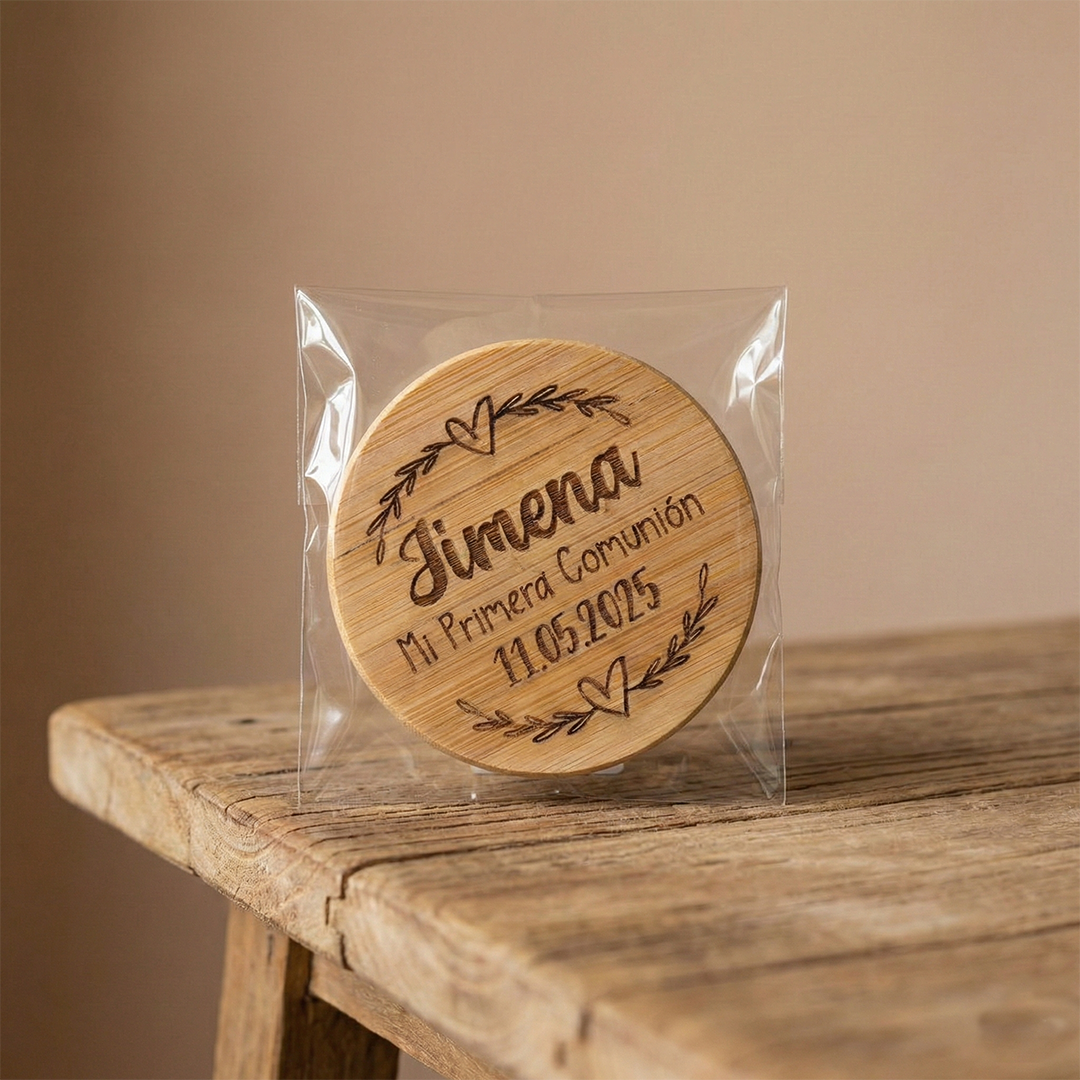 El abridor redondo para comuniones de bambú es el detalle perfecto para tus invitados: útil, bonito y grabado con el nombre y la fecha de la Primera Comunión. Hecho en nuestro taller con mimo para que cada pieza sea un recuerdo único y duradero.