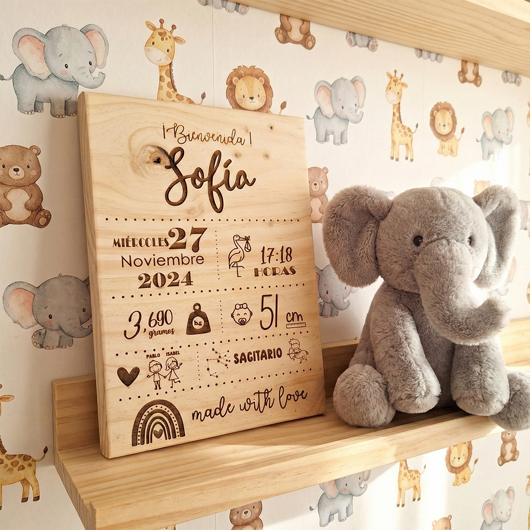 Natalicio en pino macizo grabado con los datos del nacimiento del bebé (nombre, fecha, hora, peso y medida). Hecho a mano, cálido y duradero. Ideal para regalo de nacimiento, bautizo o para decorar la habitación infantil.