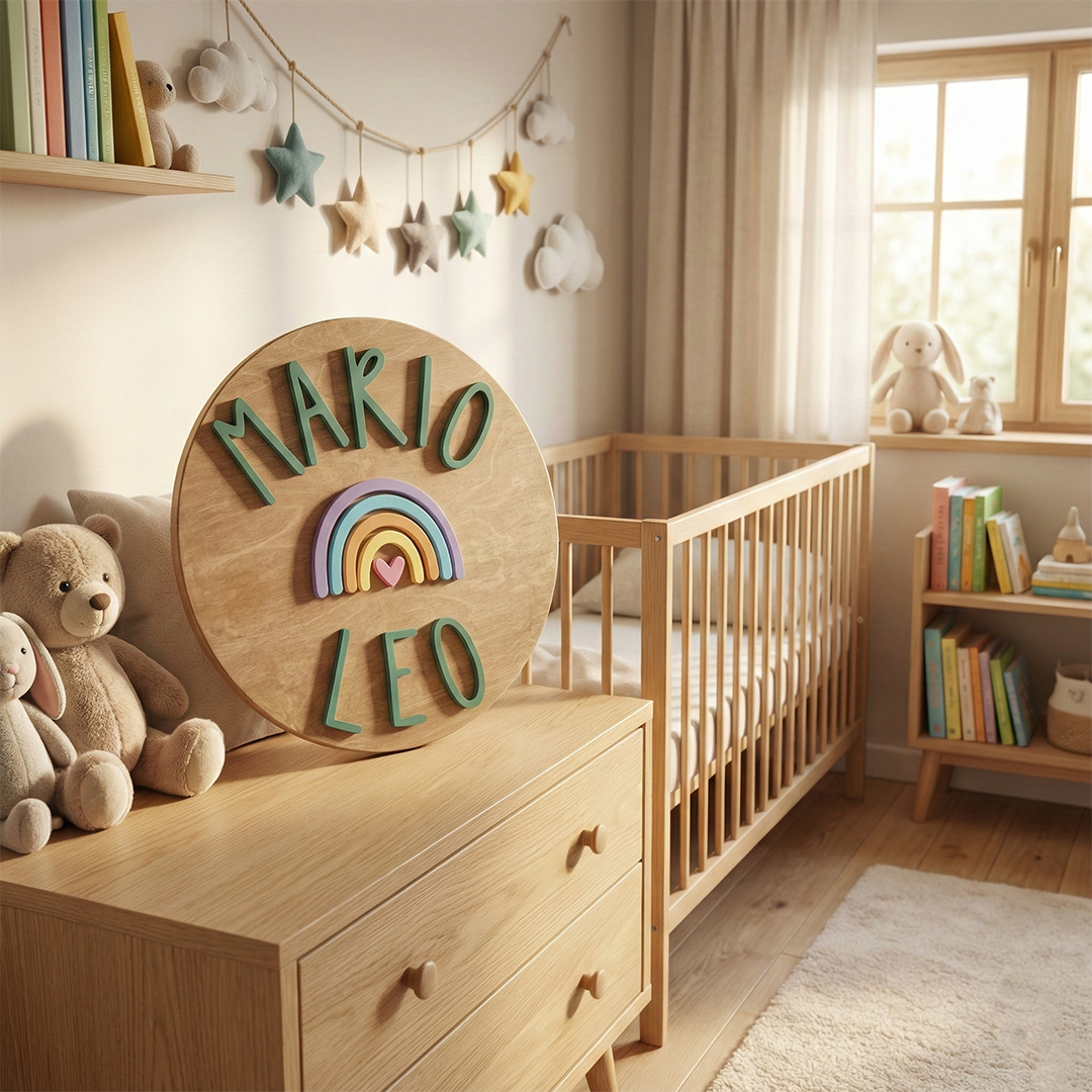 Bienvenida a la pieza que lo cambia todo: nuestra lámpara redonda personalizada de madera, con nombre en relieve y arcoíris de colores suaves. Emite una luz LED cálida que arropa el sueño, decora con ternura y se convierte en un recuerdo lleno de significado. Hecha a mano en España, lista para colgar y emocionar desde el primer día.
