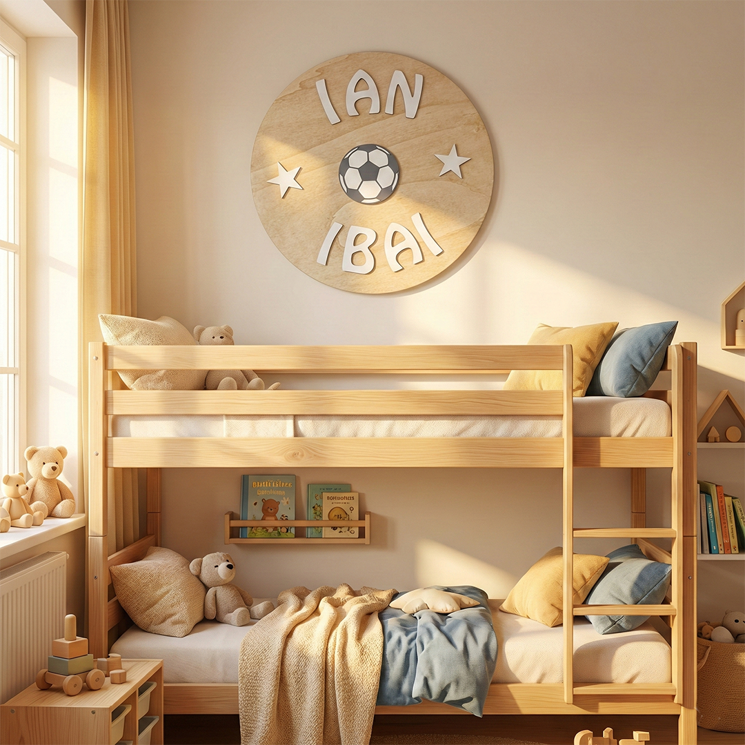 Si sueñas con una lámpara redonda personalizada que una diseño bonito, luz serena y ese toque emocional que hace hogar, la acabas de encontrar. En De Tal Palo Tal Regalo la fabricamos una a una, con madera natural y acabados al agua para que el resultado sea suave a la vista y amable al tacto. El círculo de madera abraza un arcoíris en relieve y el nombre del peque con tipografía dulce: un conjunto equilibrado que encaja en habitaciones nórdicas, boho o clásicas. Al encenderla, la aureola crea un halo acogedor que convierte cualquier rincón en refugio —perfecto para leer el cuento, dar el último beso y desear “buenas noches”.