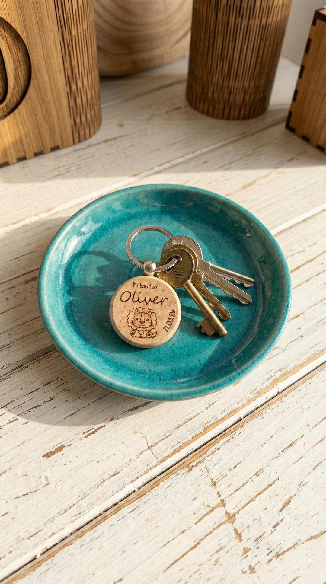 El día del bautizo está lleno de primeras veces, fotos y abrazos. Si buscas un detalle útil, bonito y con alma, nuestro llavero bautizo personalizado es ese recuerdo que los invitados se llevan y usan a diario. Fabricado en madera natural y grabado uno a uno con el nombre que nos indiques, este llavero grabado para bautizos es un “gracias por venir” que cabe en el bolsillo y permanece en el tiempo. Su diseño redondo con corona vegetal combina con decoraciones clásicas, campestres o boho; y su tacto suave recuerda que cada pieza se ha hecho con mimo en nuestro pequeño taller.