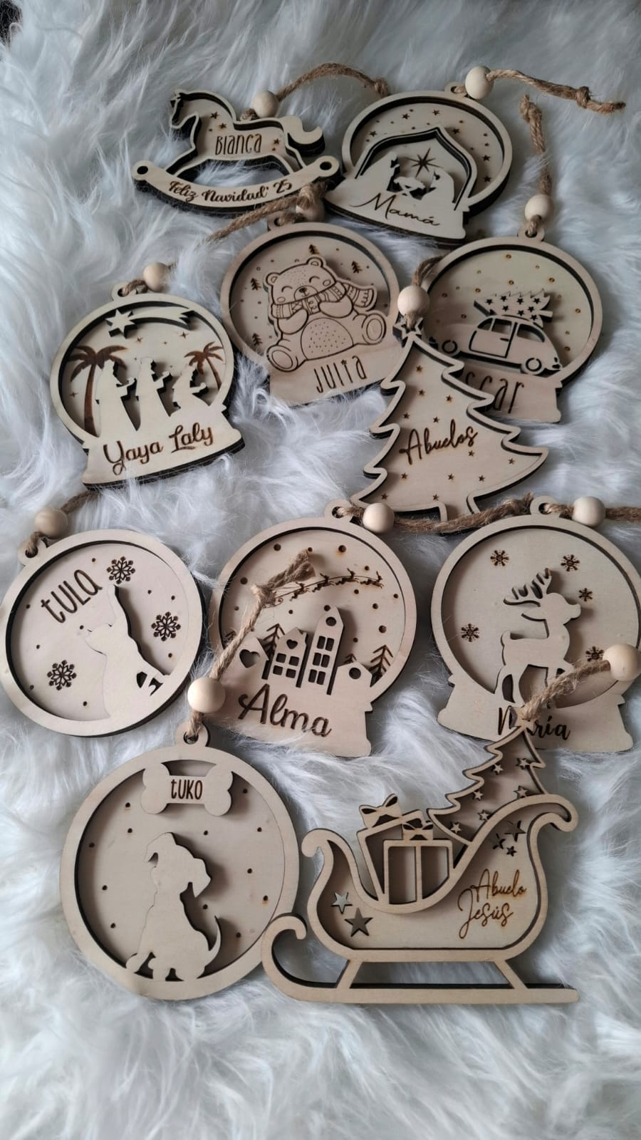 Colección 2025 de bolas navideñas artesanas, en madera sostenible y personalizadas con nombre o año. Ligeras, duraderas y listas para colgar. Diseños para peques, familias y amantes de la Navidad. Elige el nombre, una fecha especial o un mensaje corto y nosotros lo grabamos con un acabado limpio y duradero. Son un detalle perfecto para la familia, regalos de amigo secreto o para decorar eventos y escaparates.